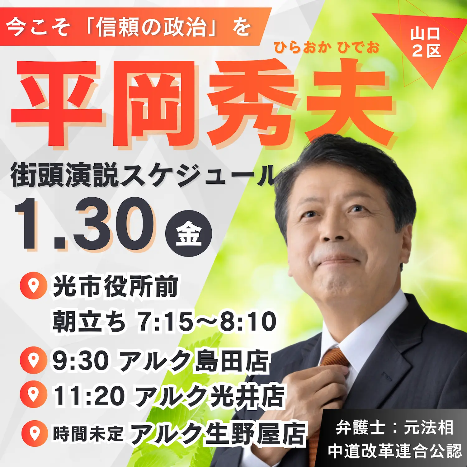 【1月30日(金)】街頭活動・演説スケジュールのお知らせ 新着情報 2026.01.29 1月30日(金)は、山口2区・光市で街頭演説を行います。 光市役所前(朝立ち 7:15〜) アルク島田店 アルク光井店 アルク生野屋店(時間未定) 一か所一か所で、皆さんの声を直接伺い、その想いを政治につなげたい。 支えてくださる皆さんと触れ合うひとときが、私にとって何よりの力になります。 見かけたら、ぜひお気軽にお声がけください。 世襲にNO。裏金にNO。 信頼を取り戻す政治を、ここから。 #平岡秀夫 #山口2区 #中道改革連合 #世襲にNO #裏金にNO #信頼の政治