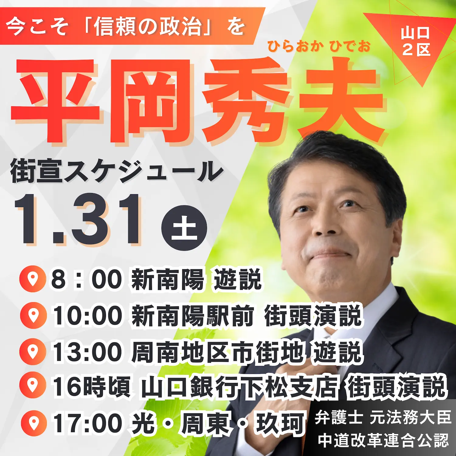 【1月31日(土)】街頭活動・演説スケジュールのお知らせ 新着情報 2026.01.30 【街頭演説のご案内|1月31日(土)】 今こそ「信頼の政治」を取り戻すために。本日、山口2区各地で街頭演説を行います。 📍8:00〜 新南陽・住宅地エリア📍10:00〜 新南陽駅前📍16時頃〜 山口銀行下松支店(光市〜岩国市方面を回ります) 世襲にNO。裏金にNO。現場で声を聞き、まっすぐ政治につなぐ。その想いで、一日立ち続けます。 見かけた際は、ぜひお気軽にお声がけください。 #平岡秀夫#山口2区#街頭演説#信頼の政治#世襲にNO#裏金にNO