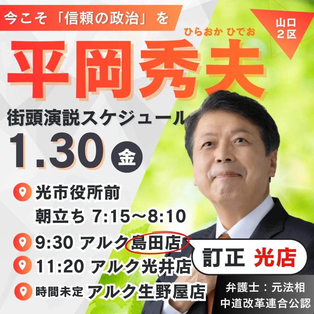【お詫びと訂正】本日1月30日(金)の街頭演説スケジュール 新着情報 2026.01.30 【お詫びと訂正】本日1月30日(金)の街頭演説スケジュールにつきまして、告知画像内の記載に一部誤りがございました。深くお詫び申し上げますとともに、下記の通り訂正させていただきます。誤:9:30 アルク島田店正:9:30 アルク光店「島田店」ではなく「光店」となります。 ご予定いただいております皆様には大変ご迷惑をおかけし申し訳ございません。何卒よろしくお願い申し上げます。