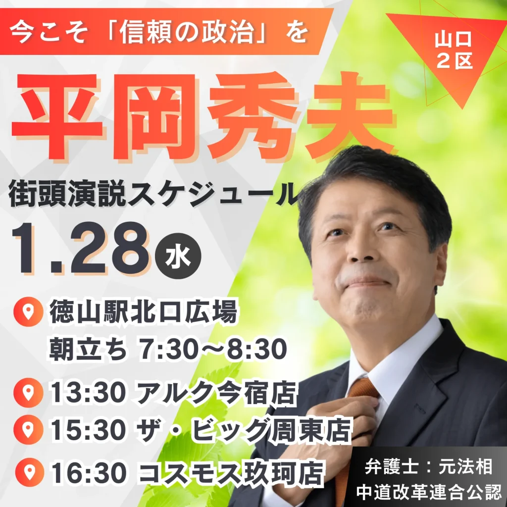 明日 1月28日(水) は、周南市・岩国市を中心に、朝立ちおよび街頭演説を行います。