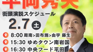 新着情報 【2/7(土) 街頭演説情報】最終日 岩国市・周南エリアの皆さまの元へ 2026年2月7日(土)の平岡秀夫・街頭演説スケジュールをご案内します。午前8時の周南・田布施エリアを皮切りに、ゆめタウン南岩国、中央フード平田、岩国駅西口にて訴えを行います。19:45からは岩国市事務所にて「マイク納め」を実施。ぜひ皆さまの声をお聞かせください。 2026.02.06 新着情報