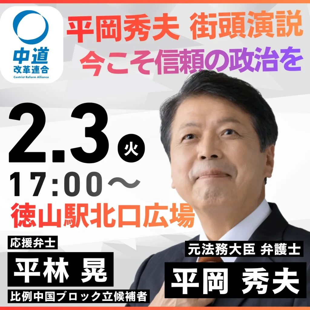 【2月3日(火)17:00から】徳山駅北口広場にて街頭演説を行います