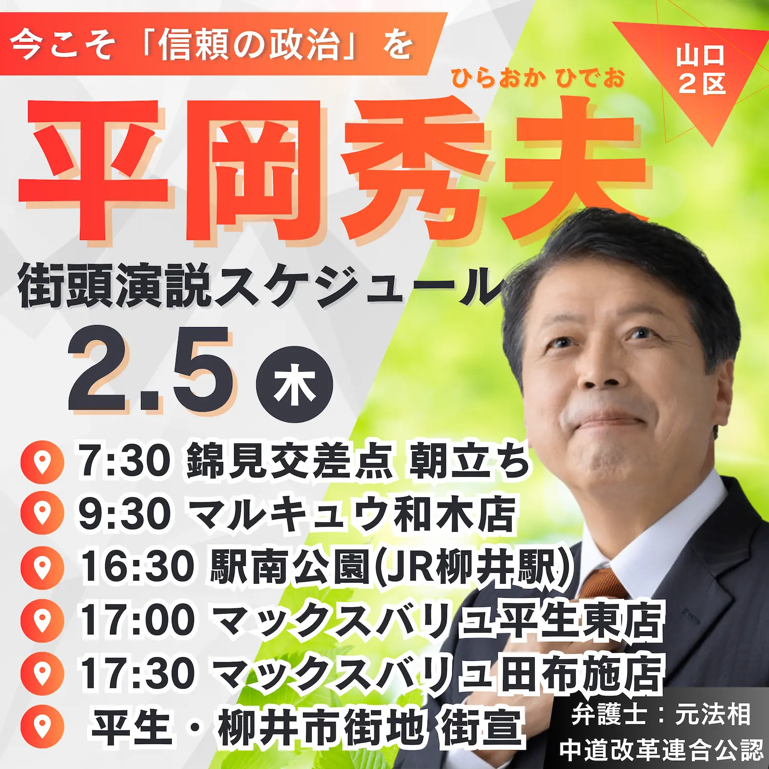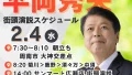 明日、2月5日(木)の街頭演説スケジュールが決定いたしました。